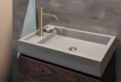 Bij het derde model, de Doppio, staat de kraan verlaagd aan de zijkant of achterkant van de wasbak. Dit model is alleen beschikbaar met één wasbak. Dat geldt ook voor de Discendente, een wasbak die afloopt naar de zijkant.