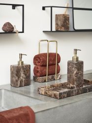 Aquanova heeft dit jaar drie kleurenpaletten ontwikkeld voor haar badkameraccessoires, waaronder Umber. Dit is een terracotta-achtige tint die zich goed laat combineren met zwart en marmersoorten. Met deze kleur creëer je een hammam in huis.