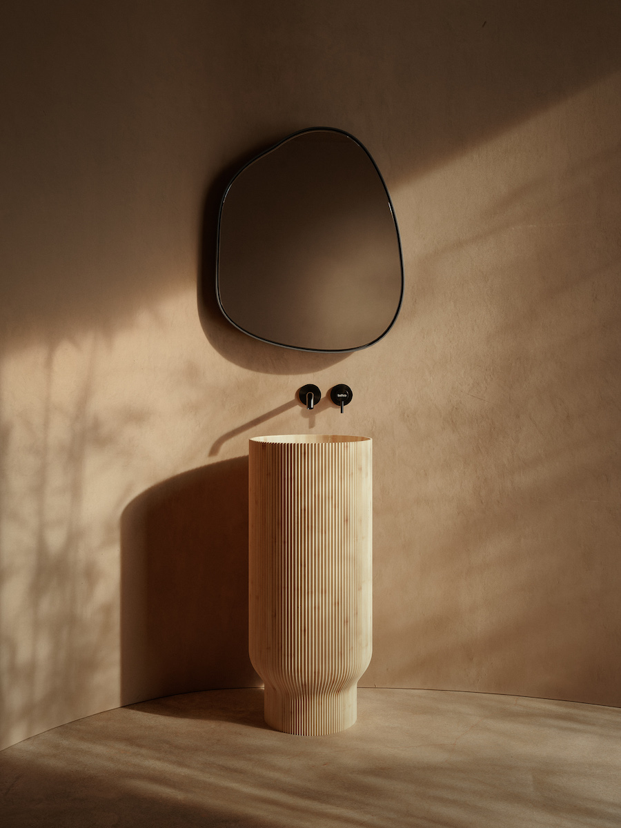 Een ander belangrijk hoogtepunt was de introductie van bamboe als basismateriaal in onder meer de Kalasin sokkelwaskom en de Treviso-collectie. Deze opbouwwaskom is combineerbaar met roestvrijstalen ringen in verschillende afwerkingen, wat zowel esthetische als functionele meerwaarde biedt. Hiermee onderstreept Bathco zijn streven naar circulaire productontwikkeling en innovatieve materiaaltoepassingen.