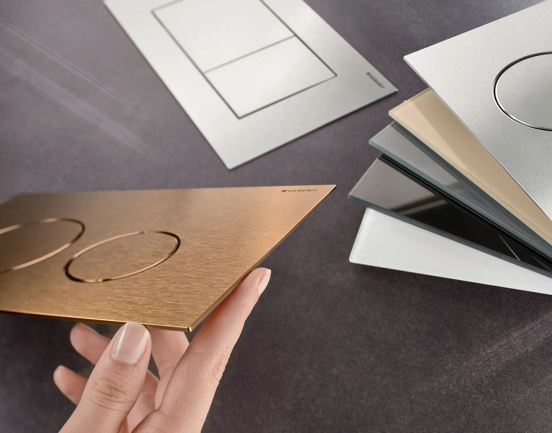 De nieuwe Sigma40 bedieningsplaat van Geberit is flinterdun. De plaat is slechts vier millimeter dun, ontworpen in een panoramisch formaat en verkrijgbaar in verschillende kleuren.