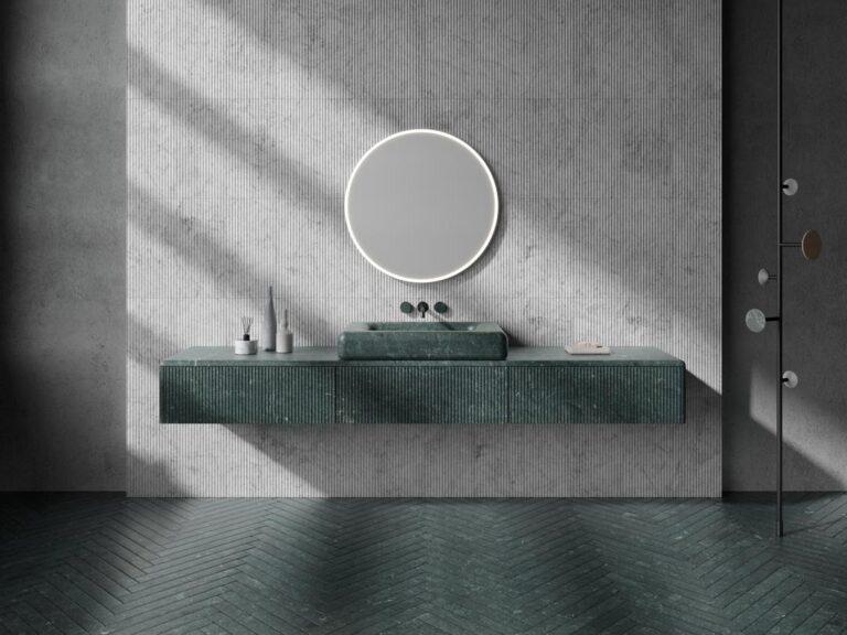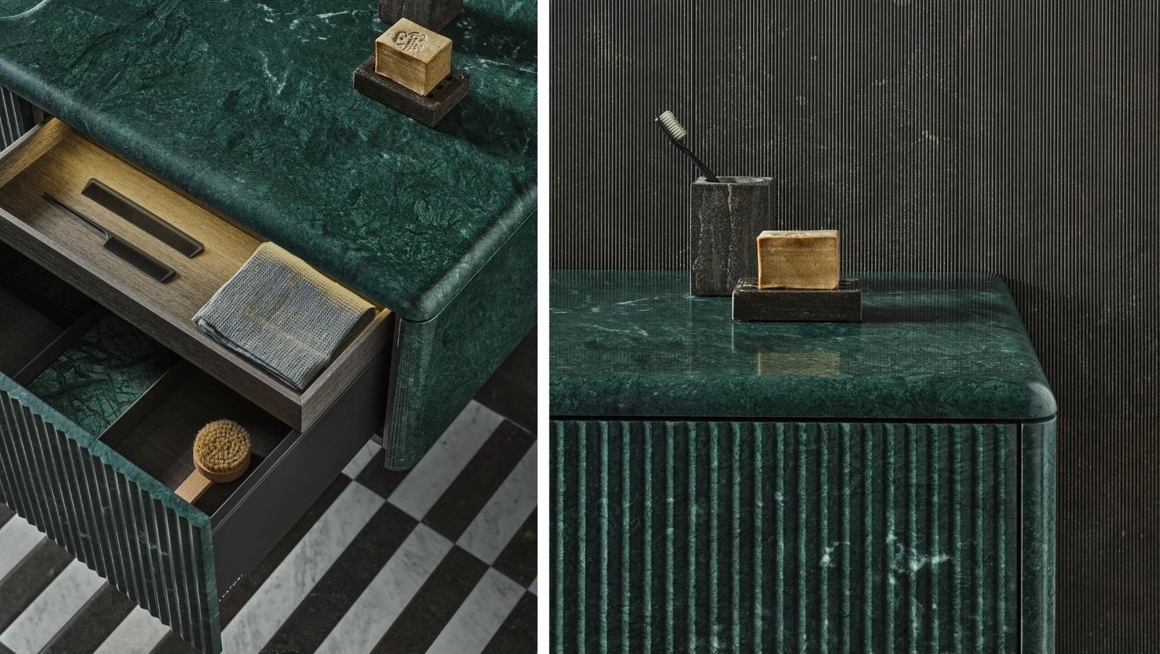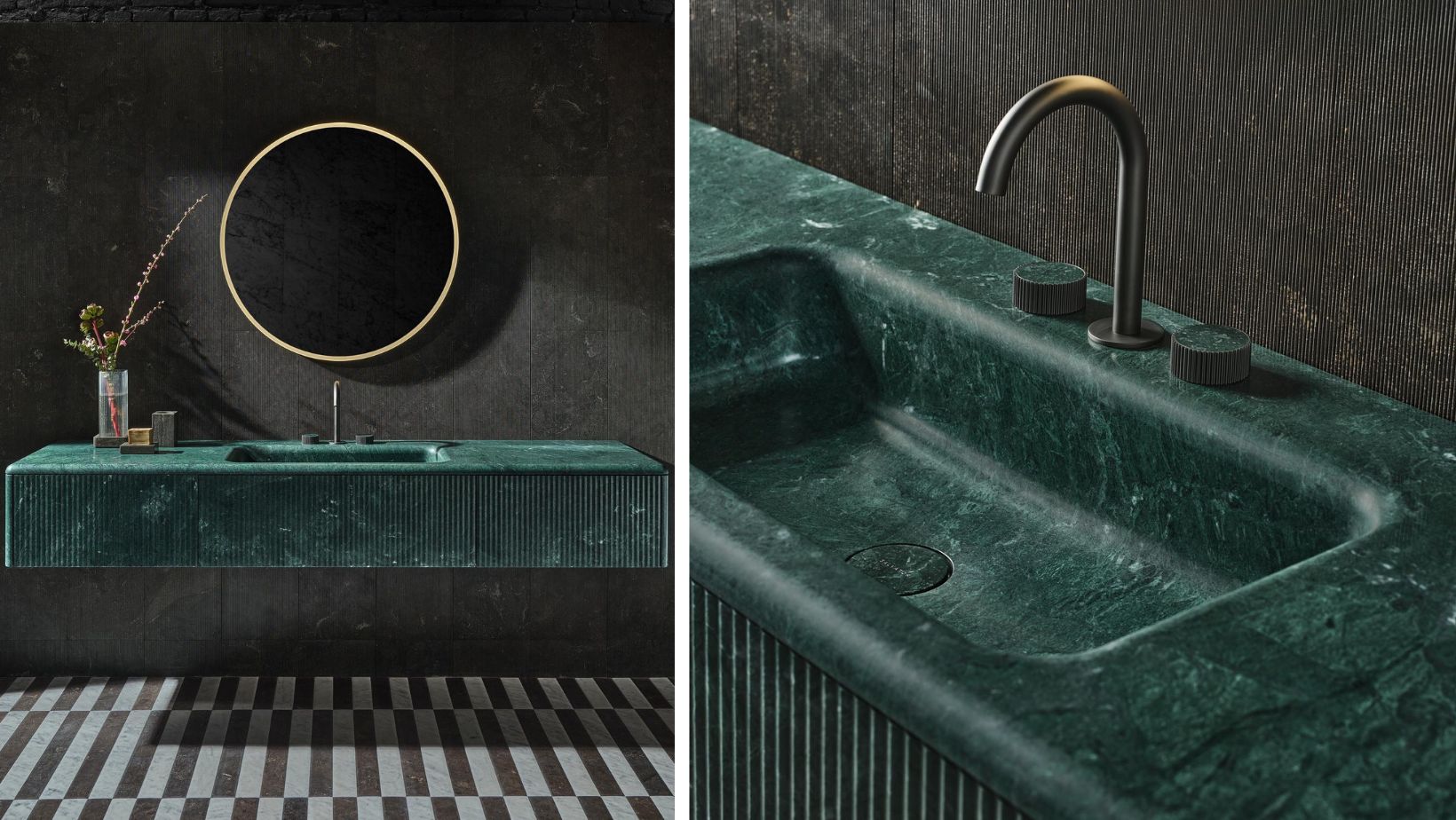 De Italiaanse designstudio Salvatori presenteert de nieuwe badkamercollectie Nereo, ontworpen door Elisa Ossino. In deze serie staat natuursteen centraal.