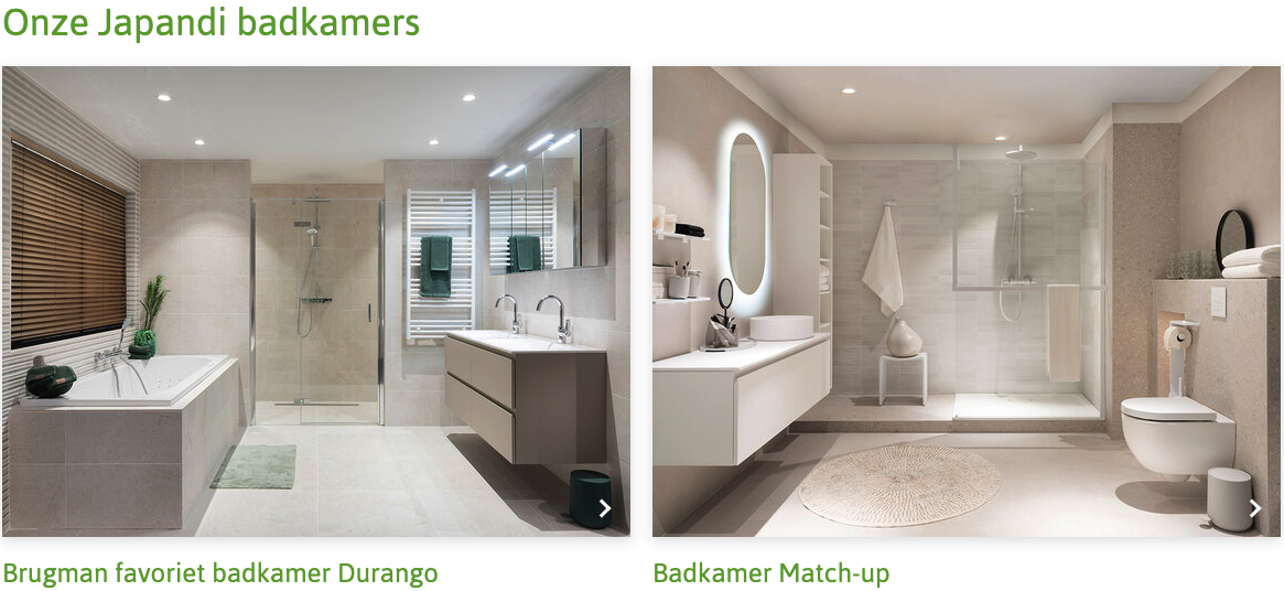 Brugman Badkamers biedt bijvoorbeeld Japandi-inspiratie met warme, natuurlijke badkamerstijlen en houtachtige meubels die de kalme esthetiek benadrukken. In de linkerfoto is het kleuraccent een saliegroen. Het grote voordeel van een neutraal Japandi-interieur is dat je met een accent gelijk een sfeer kunt neerzetten, maar dat je deze ook snel kunt veranderen. Een paar nieuwe handdoeken, prullenbakje en badmat zijn voldoende. De basis van het badkamerontwerp blijft tijdloos.
