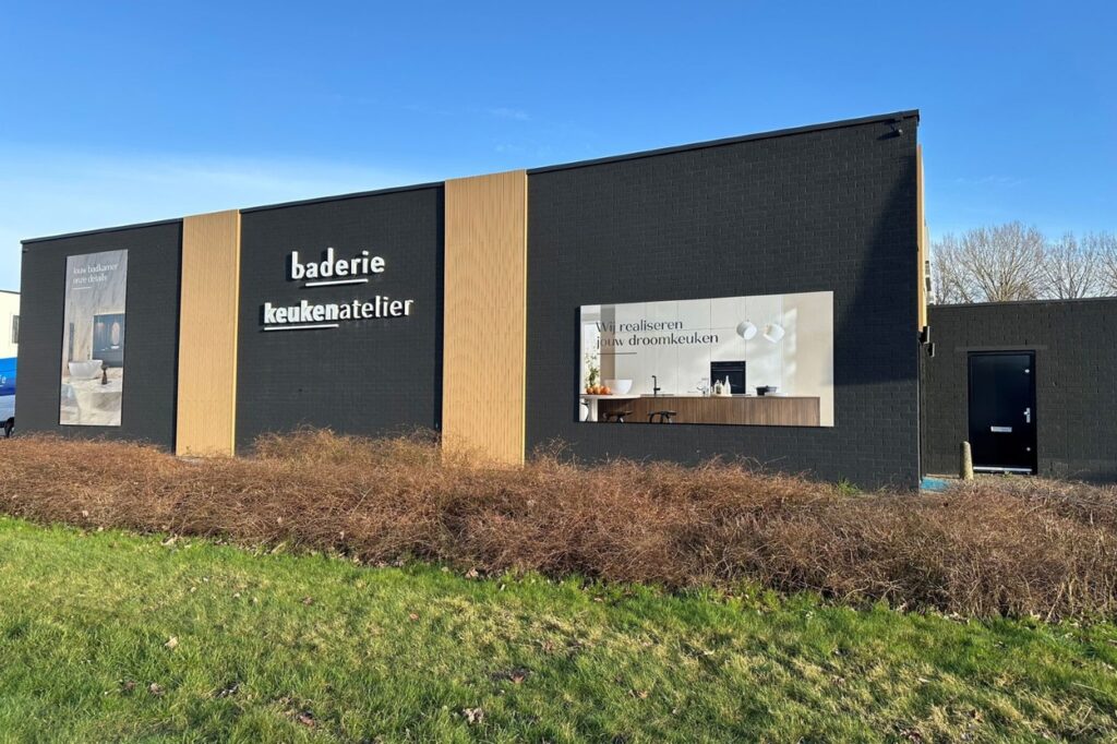 Baderie Almere en Keukenatelier Almere sloegen de handen ineen voor een vernieuwde gevel voor hun gezamenlijke pand. De aanpassing moet de gedeelde identiteit en werkwijze van beide bedrijven duidelijker zichtbaar maken voor klanten en voorbijgangers.